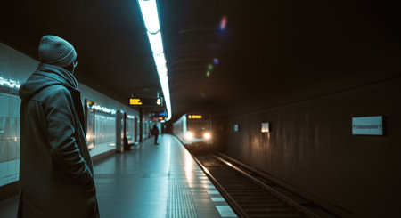 Businessman in a suit waits for a train at a dimly-lit subway station, symbolizing urban life