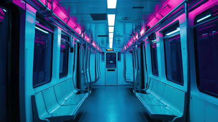 Empty subway train interior illuminated with vibrant pink and blue neon lights. Generative AI