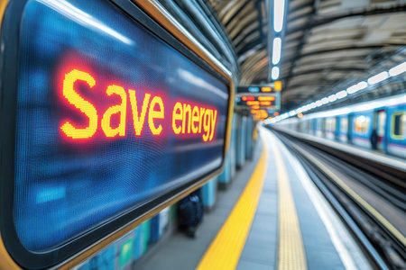 A vibrant digital screen displaying a reminder to save energy in a busy subway station. Commuters navigate the urban environment amid bright lights and sleek design.
