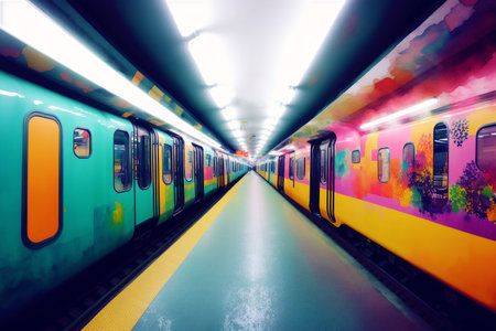 Exploring the Depths of Urban Transit as a Subway Train Emerges From a Tunnel Illuminated by Colorful Lights Generative AI