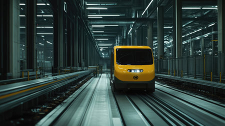 A sleek yellow train moves through a futuristic industrial warehouse, showcasing modern technology and innovative design in transportation and travel industries.