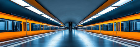 A stunning view of modern trains lined up in a vibrant railway station showcasing intricate architecture and dramatic lighting, emphasizing the heartbeat of urban transportation.
