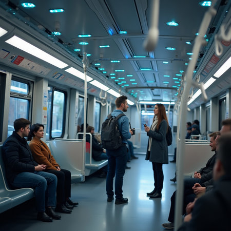 A diverse group of individuals sitting together on a subway train, commuting through a city.