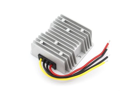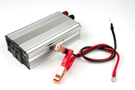 Close up of the metal mesh cases of power supply and wires are on a wooden table at the production of high-tech computers. Concept High Tech and Computer