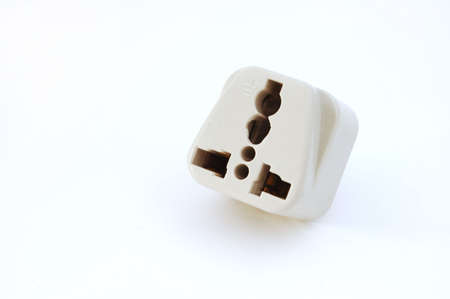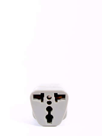 Universal travel adapter in a socket close-up. Adapter for international use of wired equipment anywhere in the world. High quality photo
