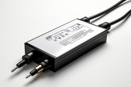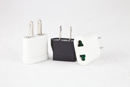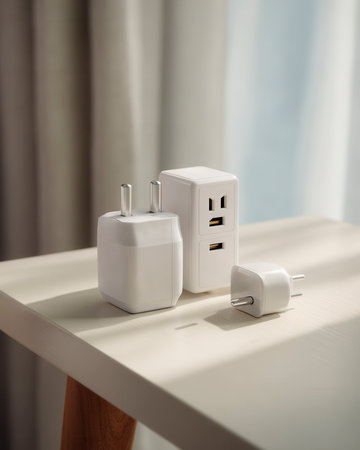 Universal power adapters placed on a table, representing connectivity, technology, and international travel concepts.