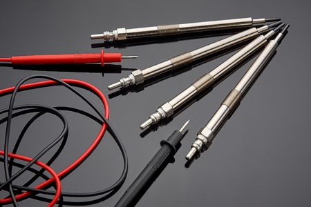 Four glow plugs for the diesel engine lie on a dark background, prepared for the next service