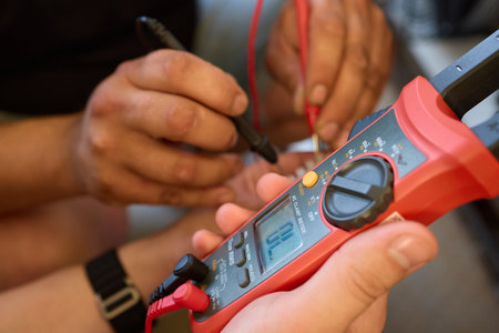 A technician uses a clamp meter to analyze electrical current for safety during repairs