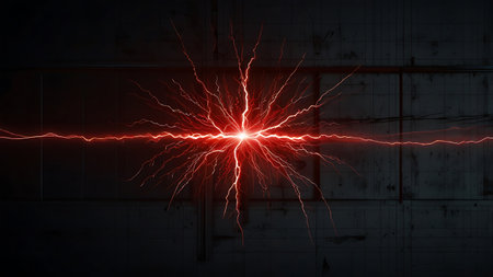 Abstract red lightning strike with smoke and sparks effect