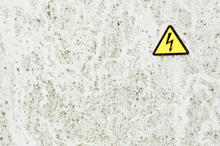 Texture of white iron metal rusty shabby painted paint spit wall and yellow warning triangular danger high voltage sign. The background.