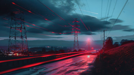 Nighttime power grid starry sky with high voltage lines and light trails from passing cars