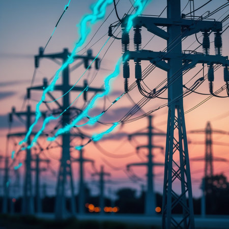 An image showcases a power plant featuring tall metal structures and overhead wires against a cloudy evening sky. The composition emphasizes the industrial nature, with dark hues, creating a sense of scale and providing a visual of energy. Suitable for various uses within the energy and infrastructure sectors.