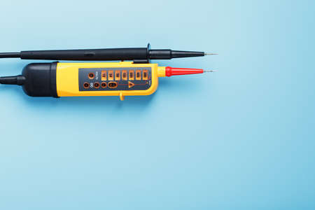 Two-pole voltage indicator close-up on a blue background. Testing and verification of electrical networks
