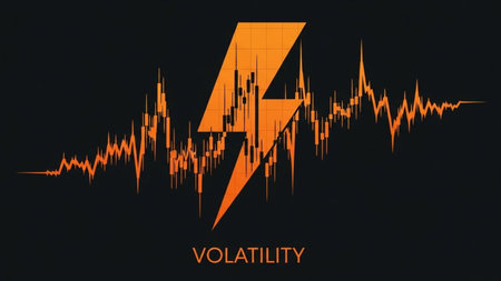 The image depicts a graph illustrating market volatility. The graph features a jagged line representing fluctuations in market values, with an orange lightning bolt symbol superimposed over the graph. The word 'VOLATILITY' is prominently displayed at the bottom, emphasizing the theme of the image. The background is dark, which contrasts with the bright orange elements, making the data and the concept of volatility stand out clearly.