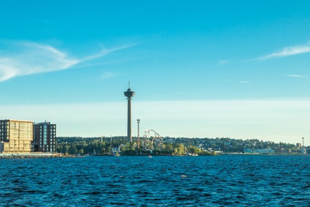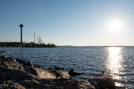 Tampere, Finland - 24 June 2019: Sarkanniemi amusement park with Nasinneula tower, view over the water at sunset