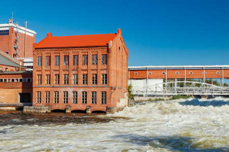 Kouvola, Finland - 15 September 2020: Old red brick buildings of Upm factory on rapids Kuusankoski.