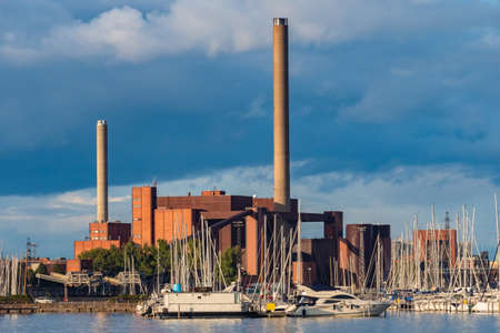 Helsinki. Finland. City embankment. Marina for yachts in Helsinki. City harbor. Thermal power plant. Harbor against the backdrop of an industrial building. Tours to Finland. Industrial landscape