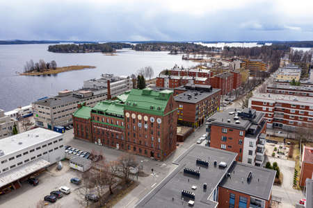 Kuopio, Finland - April 28, 2020: Aerial view of the rebuilt old building of mill to the modern apartment building. Oy Gust Ranin old mill.