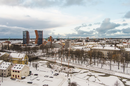 Scenic aerial view of the Old town of Klaipeda, Lithuania in golden evening light at winter. Klaipeda city port area and it's surroundings on chilly and snowy winter day.
