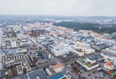 Aerial view of Lahti city, Finland. Apartment buildings with red roof.