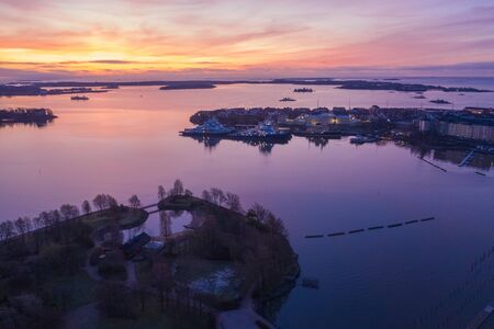 Scenic spring evening sea sunset in the harbor of the Old Town of Helsinki, Finland