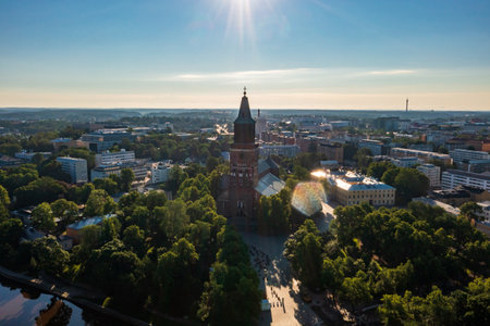 Aerial drone view of the Turku cathedral, sunny summer morning, in Finland