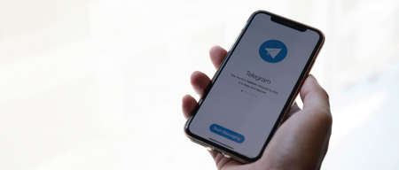 CHIANG MAI, THAILAND MAY 6 2020 : Telegram application icon on Apple iPhone Xs screen close-up. Telegram app icon. Telegram is an online social media network. Social media app