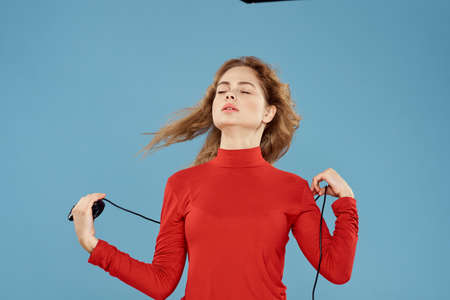 Pretty woman gamepad in hands playing games entertainment consoles to lifestyle blue background red jacket