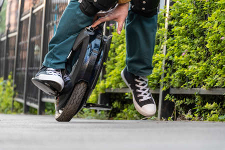 Riding an electric unicycle (EUC). A rider in protective knee pads falls from an e-monowheel.