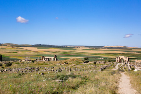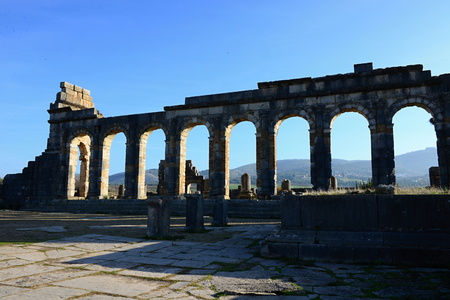 Volubilis Roman ruins in Morocco- Best-preserved Roman ruins located between the Imperial Cities of Fez and Meknes on a fertile plain surrounded by wheat fields.