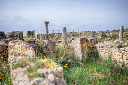 Stone ruins featuring columns and walls of Volubilis, Morocco, surrounded by vibrant wildflowers and lush greenery, highlighting the blend of history and nature in a tranquil setting