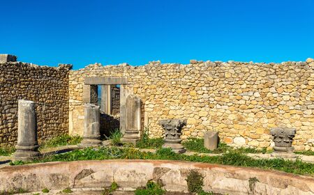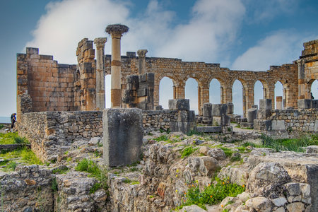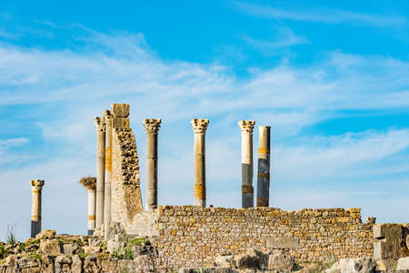 Volubilis, Morocco - Oct 14, 2019: Ruins of the roman basilica of Volubilis, a UNESCO world heritage site near Meknes and Fez, Morocco