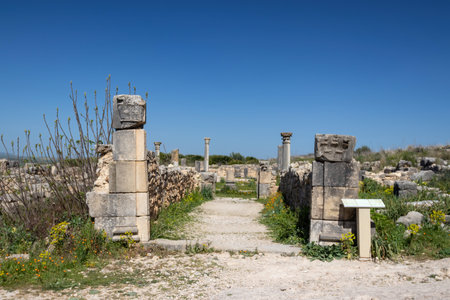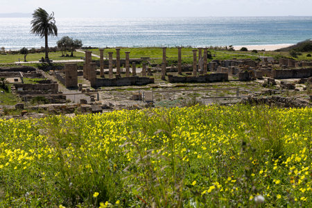 Roman archeological site with forum and stone architecture ruins in Baelo Claudia on the Spanish coast with ocean view on coasta de la luz on a bright sunny day with blue sky.