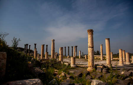 Agora columns with great sky viewin Perge or Perga ancient Greek city - once capital of Pamphylia in Antalya Turkey on warm October afternoon.