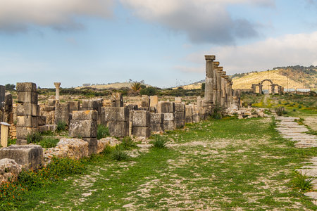 Decumanus Maximus in Roman ruins, ancient Roman city of Volubilis. Morocco. North Africa
