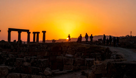 Sunrise at Ancient Roman Ruins (Umm Qais) (Giordania) Jordan Image features a square, grass, flowers, pillars (stone columns) This place is on a hill overlooking golan heights.