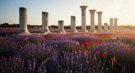Line of ancient stone columns with decorative capitals in a field of vibrant lavender and red poppies at sunset