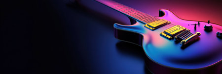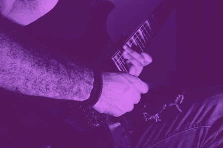 closeup of male guitarist in the dark playing with velvet violet lighting, graphic resource for music industry with copy space.