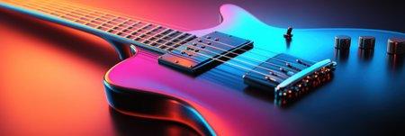Musical instrument guitar body close-up an macro background, red color light, bokeh and blur focus. Blue and red colors.