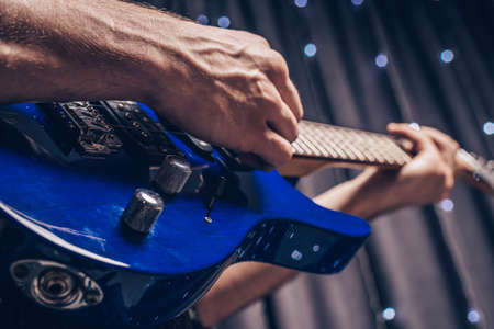 Close up of male hand playing electric guitar in the dark
