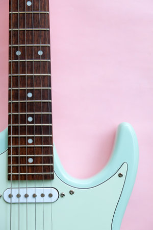 Detail of Mint Green Electric Guitar on a Pink background.