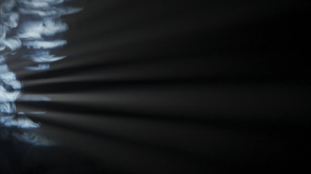 Bright linear spotlights rays of professional lighting equipment flashing in darkness on black background from right side, smoke streams floating up.
