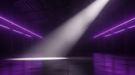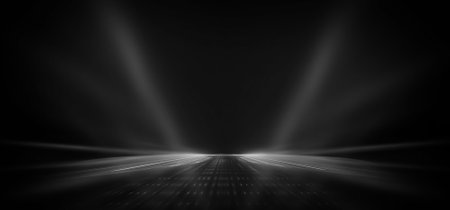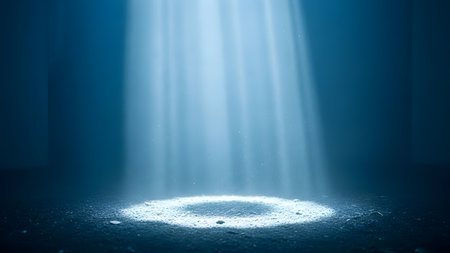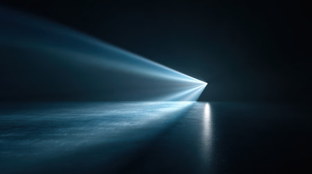 A captivating spotlight shines dramatically in an empty dark space, creating soft shadows and vibrant light contrasts, ideal for artistic and abstract backgrounds.