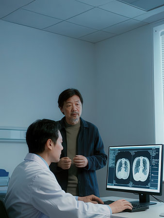 asian doctor explaining x-ray results to senior patient in hospital