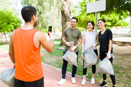 Promoting good deeds on social media. Rear view of a latin man taking a picture with a smartphone of his group of friends doing plogging at the park