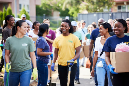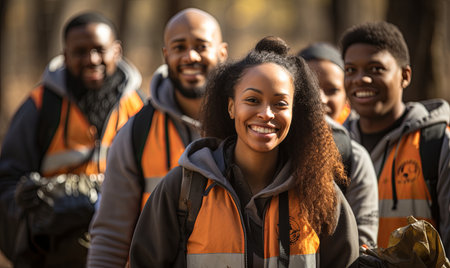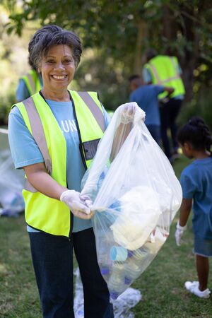 Multiethnic volunteers donate their time holding black garbage bags to collect plastic waste for recycling to reduce pollution in a public park