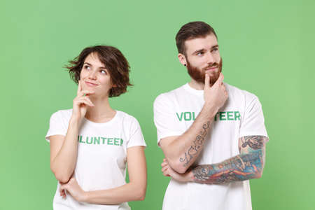 Pensive two young friends couple in white volunteer t-shirt isolated on green background. Voluntary free work assistance help charity grace teamwork concept. Put hand prop up on chin looking aside up.