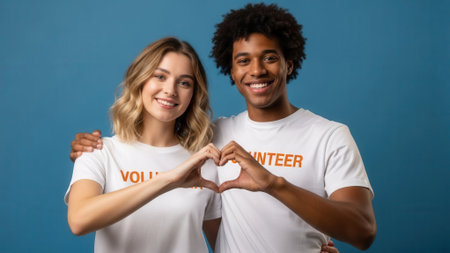 A young diverse couple, a man and a woman, wearing white volunteer t-shirts, smile and form a heart shape with their hands, symbolizing love and unity.