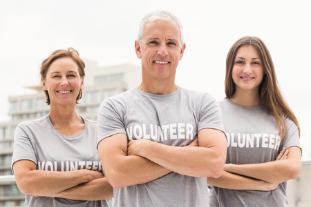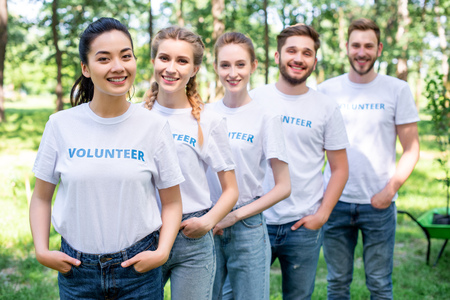 Group of smiling deverse female and male volunteers in matching tshirts looking at camera. eco conservation volunteers doing countryside clean-up.