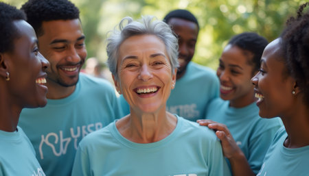A cheerful elderly woman stands at the center, surrounded by a group of young adults, all wearing matching teal shirts. Their smiles radiate warmth and camaraderie, capturing a moment of joy and connection among friends of different backgrounds.